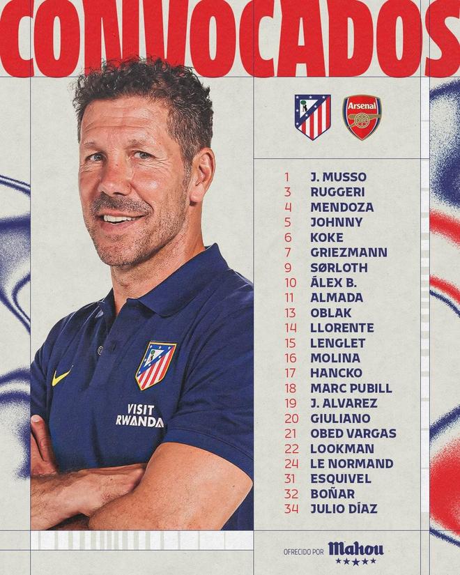 北京时间4月29日,马竞官方公布了欧冠半决赛首回合对阵阿森纳的大名单。